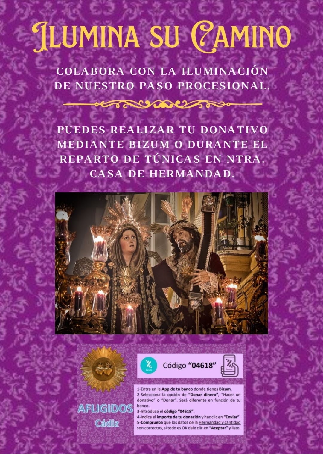 Esta hermandad de Afligidos pone en marcha la campaña de donativos a través de Bizum con el fin de que hermanos y devotos puedan colaborar en la iluminación de altar de cultos y paso de misterio de nuestros queridos titulares. El Bizum permite un modo sencillo e inmediato de colaboración con esta tu hermandad, agradeciendo cualquier aportación, que por pequeña que sea siempre ayudará a que Nuestro Padre Jesús de los Afligidos y María Santísima de los Desconsuelos estén acompañados por la Luz y brillen como se merecen.